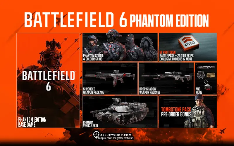 The Battlefield 6 Phantom Upgrade includes the Battlefield Pro Token, Phantom XP Boost Set, and the Phantom Pack that comes with the Phantom Squad: 4 Soldier Skins, 2 Weapon Configurations, Melee Knife Weapon Skin, Vehicle Skin, Weapon Decal, Weapon Charm, Dog Tag.